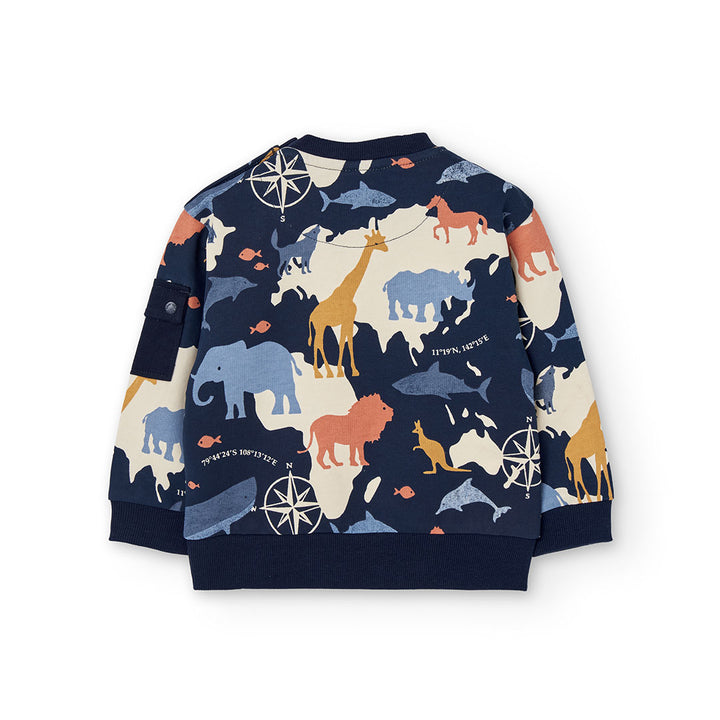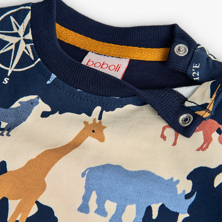 Sudadera de felpa para niño en color azul marino, ideal para mantener a los pequeños abrigados y confortables durante las estaciones más frías. Confeccionada en suave algodón, Presenta un encantador estampado de animales en tonos azul, mostaza y terracota sobre un fondo azul marino. Diseño que incluye un cuello redondo, mangas largas y prácticos botones a presón en el hombro para facilitar el cambio de ropa.