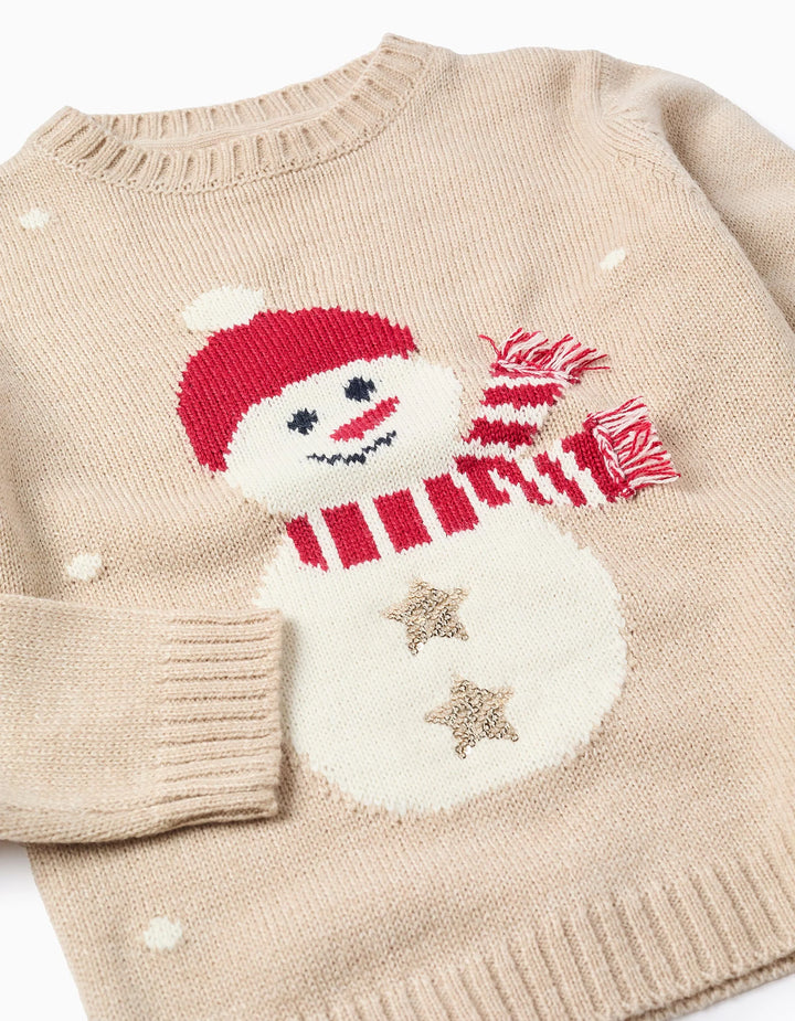 Jersey de punto beige para niña con muñeco de nieve en jacquard. Detalles de copos de nieve y estrellas de lentejuelas doradas. Bordes de canalé para un ajuste perfecto. ¡Ideal para looks invernales!