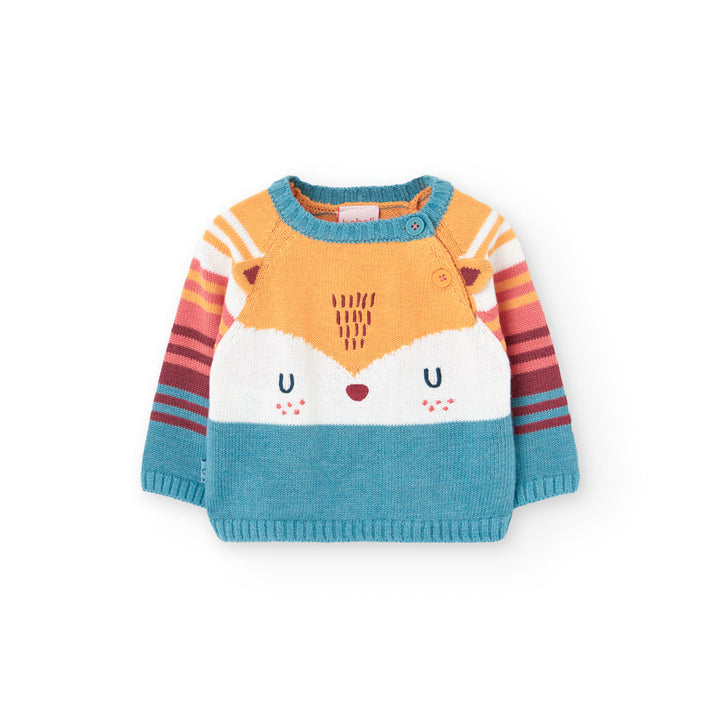 Jersey de punto amarillo, perfecto para mantener a tu bebé abrigado durante el otoño e invierno. Con un motivo de animal que aporta un toque divertido y mangas con rayas multicolor, este jersey es una opción alegre y acogedora. Su diseño de cuello redondo con botones facilita su colocación, garantizando comodidad en el día a día. Fabricado con material suave.