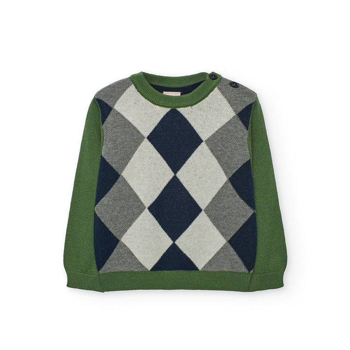 Jersey de punto verde para niño, perfecto para los meses de otoño e invierno, ofrece calidez y suavidad a la delicada piel del pequeño. Confeccionado con materiales de alta calidad, brinda confort en cada uso.este jersey es versátil y puede combinarse fácilmente con pantalon . Su diseño elegante y delicado añade un toque de estilo al conjunto de cualquier ocasión, convirtiéndolo en una prenda esencial en el armario de tu pequeño.