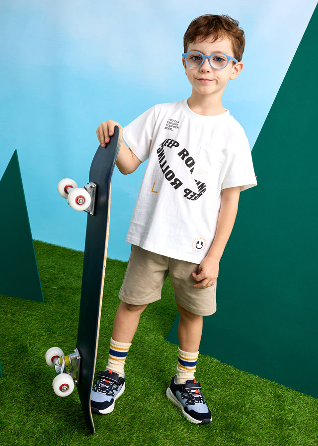 Camiseta de manga corta para niño. Cómodo tejido ligero y suave de felpa (felpa sin perchar). Bolsillo funcional en la parte delantera. Texto a modo decorativo.
