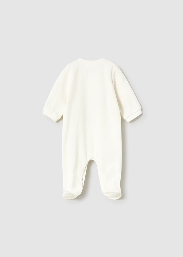 Pijama de manga larga para recién nacido. Cuello redondo. Botones a presión en la entrepierna para facilitar la puesta de la prenda. Cierre con botones a presión ocultos que permitirán vestir la prenda con facilidad. Elementos de adorno: aplique decorativo, bordado.