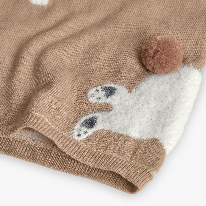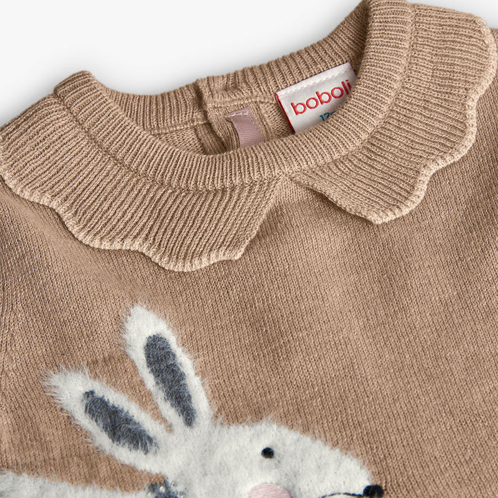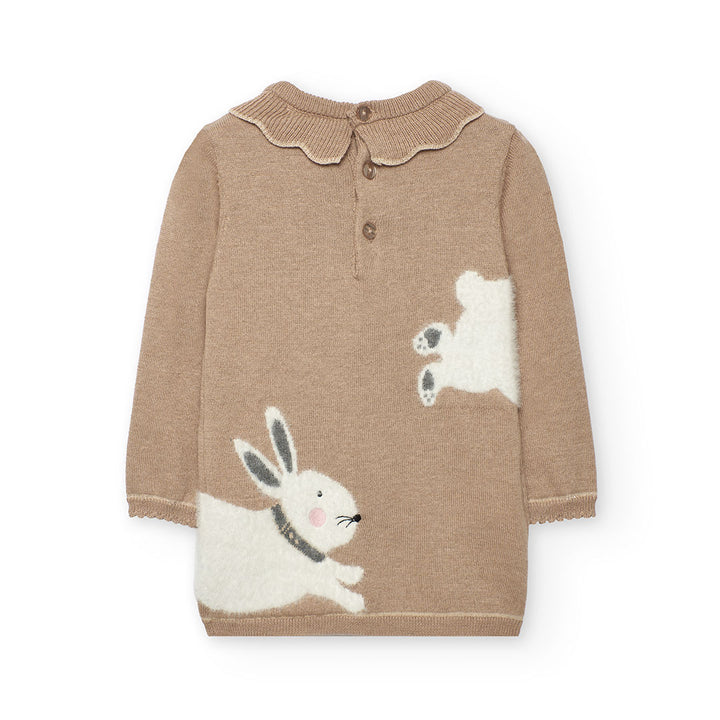 Vestido tricotosa beige para niña, con encantadores estampado de conejitos perfecto para abrigar a las más pequeñas durante el otoño e invierno. Elaborado en un tejido de punto cálido y suave, cuenta con un diseño de cuello redondo y mangas largas que asegura comodidad en los días más fríos.su tono neutro lo convierte en una pieza versátil que se combina fácilmente con otras prendas para cualquier evento o salida.
